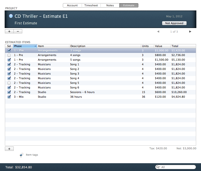I've been recording Brazilian music in the last 20 years, first in a home studio and then in a small professional studio. During this time, I always looked for an effective way to write down my recording activities, in particular things like how much time I spent to complete a job; how much has been charged for the job; how much of that has been paid for; which songs have been recorded, and so on.