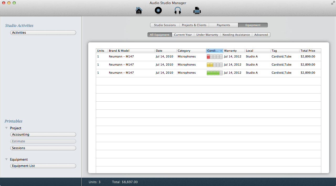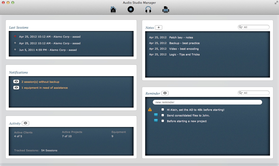 Designed to help home recordists and recording engineers to organize their recording activities, Audio Studio Manager is the first application of this category in the Mac App Store and the only one fully developed in Objective-C. And that means: easily expandable and seamless integration with Mac OS X.