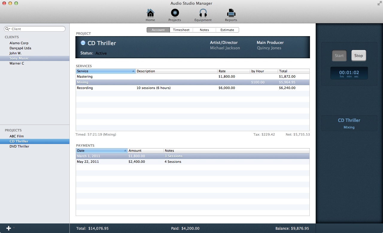 I've been recording Brazilian music in the last 20 years, first in a home studio and then in a small professional studio. During this time, I always looked for an effective way to write down my recording activities, in particular things like how much time I spent to complete a job; how much has been charged for the job; how much of that has been paid for; which songs have been recorded, and so on.
